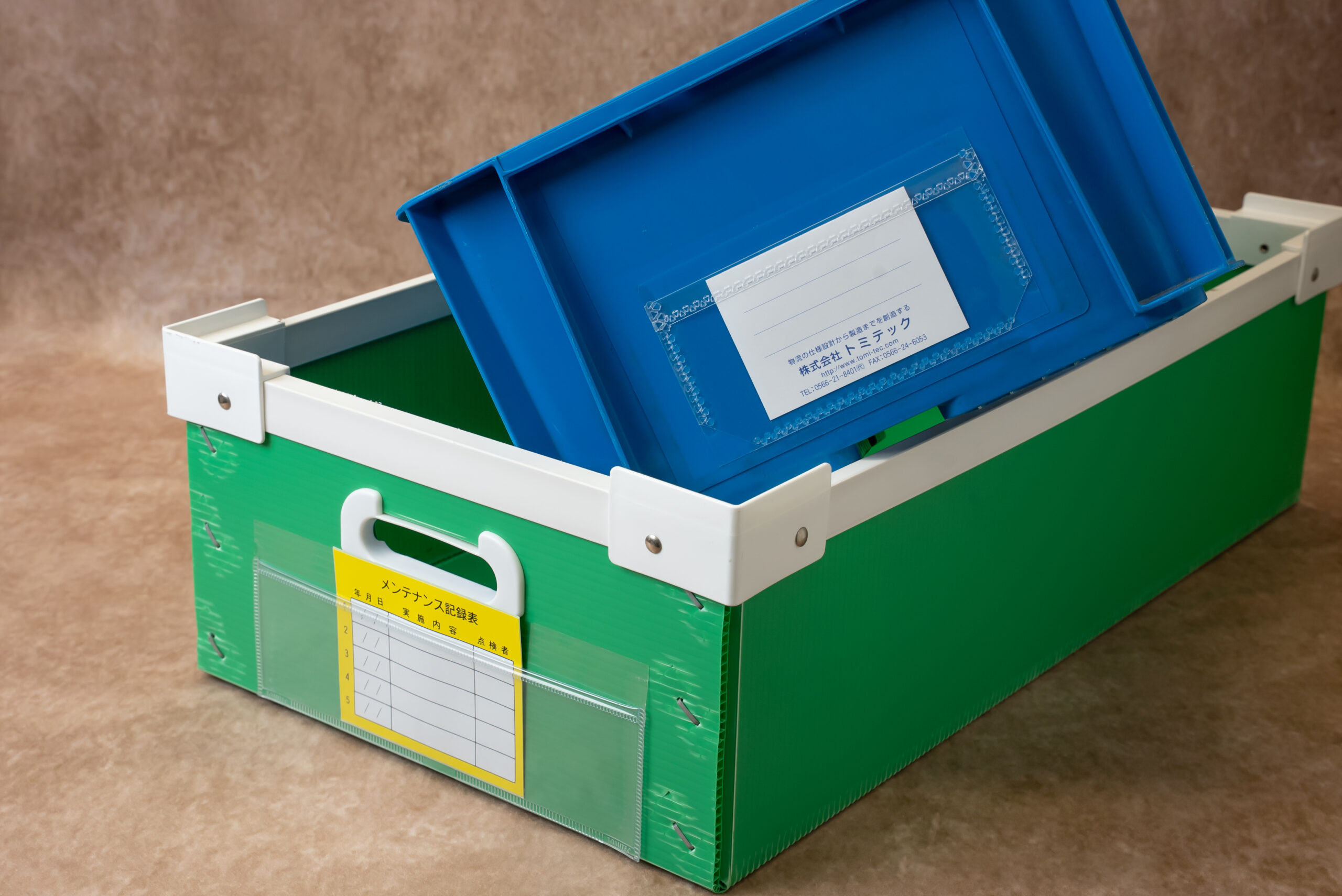 QRコードに代表される膨大な情報を収めたかんばんを収納しプラスチックコンテナーやプラスチック段ボールの通い箱に貼り使用されます。